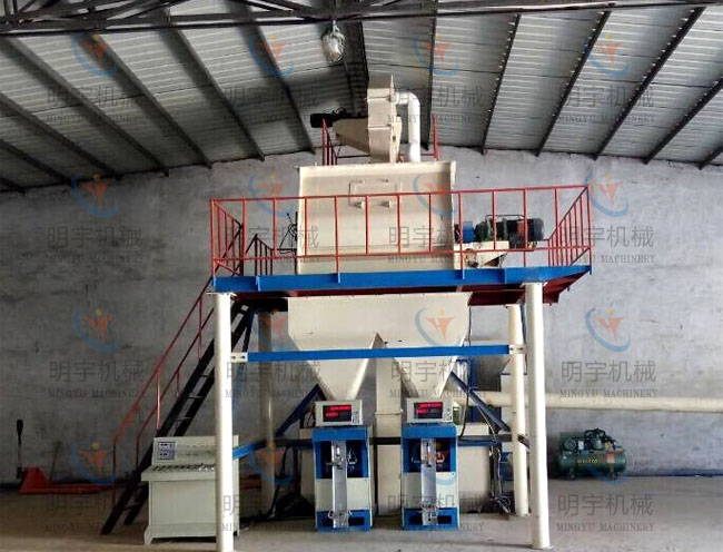 工人根据配比将原料依次投入加料斗内,由斗式提升机将物料提升至卧式无重力搅拌机,混合2-3分钟(根据不同物料混合时间略有差别)。混合好的物料依靠自身重力落至成品仓,成品仓下部配全自动称量包装机,将混合好的成品装袋包装。在包装过程中,可以重复上面投料、提升、搅拌等过程,以实现流水线作业,提供生产效率。